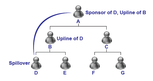 In a binary plan, you are allow to add new node into left or right sub-tree also known as(leg). When you have successfully recruit more than two people, you can spillover the rest of nodes into next available node. For example member A has left (member B) and right (member C) sub-tree and new addition member will placed underneath of member B: